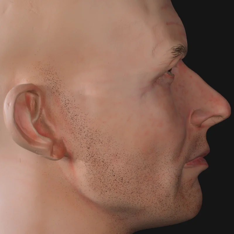 Unique lifelike airbrushed male fibreglass display head with realistic eyes and painted stubble. Fits on our museum mannequin bodies. For museums & life-size dioramas.