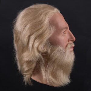 Lebensechter handbemalter männlicher Silikonkopf mit implantierten Haaren und realistischen künstlichen Augen für Schaufensterpuppen. Für Museen und lebensgroße Dioramen.